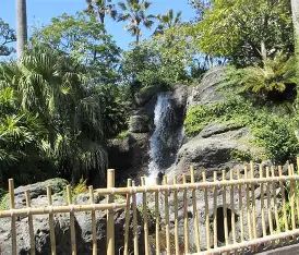 アドベンチャーランドにある滝は、南国の雰囲気を演出するための風景づくりだけでなく、実はエリア同士の境界線を自然に演出するための重要な役割を担っています。滝の音は視覚的な境界だけでなく、聞こえてくる“水の響き”によって、ゲストが次のエリアへ移動する際に雰囲気が切り替わったことを自然と感じられるように設計されています。