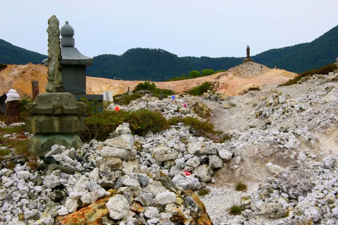 恐山で最も象徴的なのは、地獄のような荒涼地帯と温泉の噴出する岩場の景色です。強い硫黄の匂いと、白煙をあげる温泉の湧き出る地帯は、死者の世界とこの世の境目のように感じられ、「死後の世界」を連想させます。これが恐山が「霊が集まる」「死者がさまよう」と語られる背景のひとつです。